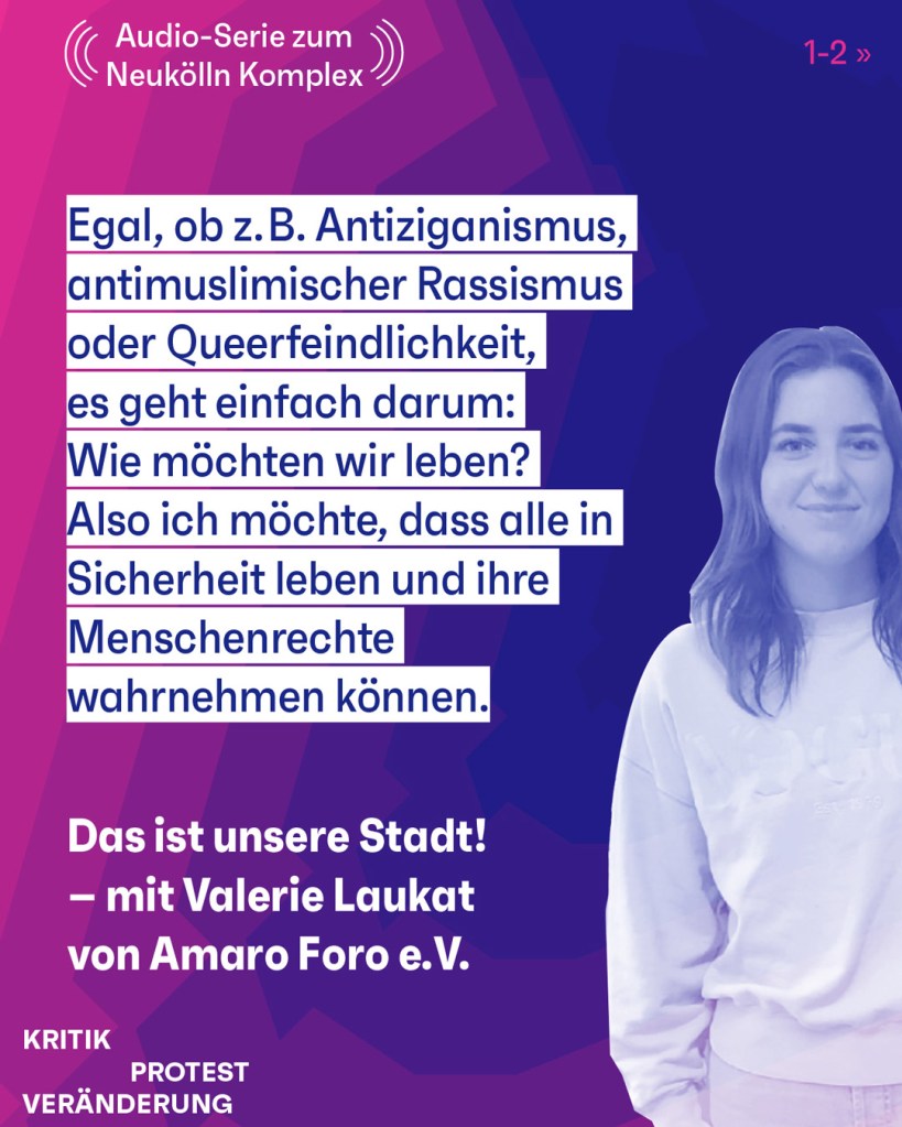 Für diese Folge von „Kritik, Protest, Veränderung. Die Audioserie zum Neukölln-Komplex“ haben wir mit Valerie Laukat von Amaro Foro e.V. gesprochen, eine Selbstorganisation von Romn*ja in Berlin.Valerie arbeitet bei Amaro Foro im Projekt DOSTA – der Dokumentationsstelle Antiziganismus. DOSTA dokumentiert seit 2014 antiziganistisch motivierte Vorfälle in Berlin. Valerie hat uns von einigen schockierenden Beispielen von Diskriminierungen von Rom*nja und Sinti*zze erzählt. Auch in der Zeit, in der die rechte Terrorserie in Neukölln maßgeblich stattfand, gab es Fälle. Unter anderem wurden Hakenkreuze und das Z-Wort an Briefkästen gesprüht. Diese Kombination aus rassistischen und nationalsozialistischen Symbolen verweist auf die Kontinuität von Gewalt gegen Rom*nja und Sinti*zze, die auch im Nationalsozialismus verfolgt und in Konzentrationslagern umgebracht wurden.